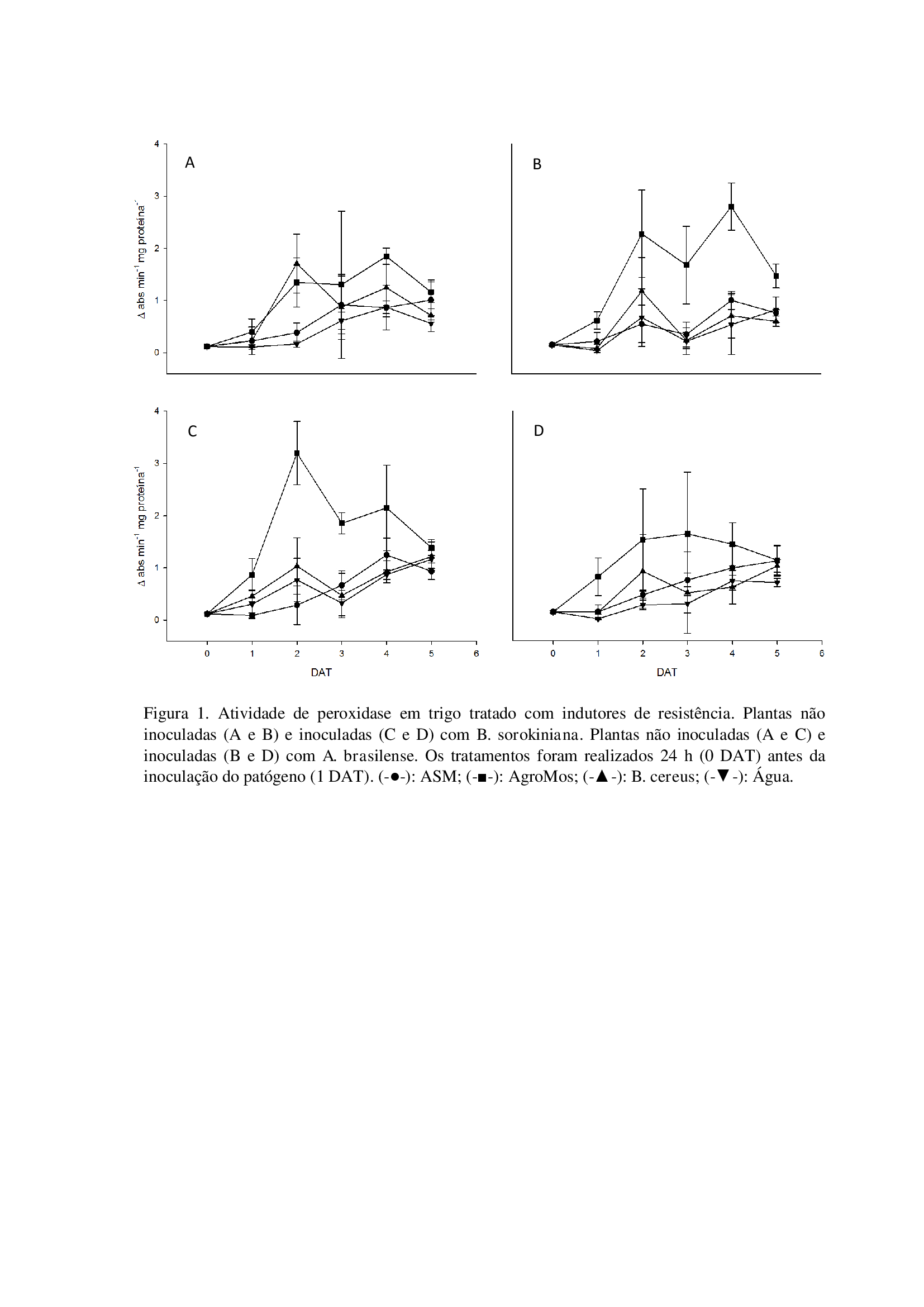 The induced resistance efficiency in the control of phytopathogens is recognized, however little is known about its interference on non-target microorganisms. The present study aimed to verify the induction of peroxidase activity by the use of acibenzolar-S-methyl (ASM), mannanoligosaccharide (MOS) and Bacillus cereus inductor in the control of spot blotch wheat disease and its interference on the non-target microorganism Azospirillum brasilense. The experiment was conduced under greenhouse condition. The experimental design was a randomized block in a factorial schema 4 x 2 x 2, with four replications. The first factor “Resistance Inductors” was constituted by ASM, MOS and B. cereus inductors and water (control). The second factor “Pathogen” was constituted by the presence or absence of B. sorokiniana pathogen. The third factor “PPGR” was made up by the presence or absence of the PPGR A. brasilense. Disease severity, peroxidase activity and quantification of endofitic diazotrofic microorganisms were assessed. There was a reduction in the disease severity by the use of resistance inductors. The activity of peroxidase was estimulated by MOS. Direct interference of the inductors on endophytic diazotrophic microorganisms was not observed.