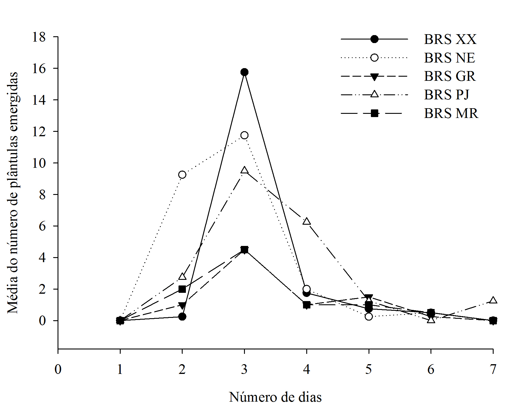 The cowpea is one of the main sources of protein for the population of the Brazilian Northeast and North regions. This study aimed to estimate the genetic parameters on seed germination and seedling emergence in cowpea cultivars. This study was conducted at the Seed Analysis Laboratory of the State University of Southwest Bahia, campus Vitória da Conquista, Bahia State, Brazil. The experimental design was completely randomized with four replications and five treatments (cultivars). The cultivars were BRS Xique-xique, BRS Novaera, BRS Guariba, BRS Pujante and BRS Marataoã. To compare means, we used the Tukey test at 5% probability. The parameters evaluated were: number of normal (SN) and abnormal (SA) seedlings, germination percentage (PG), germination speed index (ISG), percentage of emergency (PE), emergency speed index (ISE), electrical conductivity (EC) and mass of 100 grains (MHG). For the variables that were significative, genetic parameters were estimated. The coefficients of phenotypic and genotypic variation and heritability were high for variables. The relationship genotypic and environmental coefficient of variation was greater than one, indicating that the genetic effects highlighted in relation to environmental effects. The genetic gain was down to EC and MHG. For the variables related to seed germination there was no difference among cultivars. In relation to seedling emergence, BRS Novaera was better than others.
