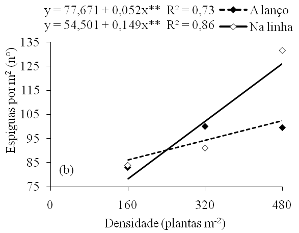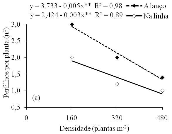 O método e densidade de semeadura constituem fatores importantes para que se obtenha boa produtividade na cultura do trigo. O objetivo do trabalho foi avaliar os efeitos de métodos de semeadura (a lanço e na linha) e densidades (160, 320 e 480 plantas m-2) sobre o desempenho do trigo cultivado em sistema plantio direto. O experimento foi conduzido no período de inverno de 2007, com os tratamentos dispostos em blocos ao acaso em arranjo fatorial 2 x 3 (métodos de semeadura x densidade de semeadura), com quatro repetições. As características avaliadas foram: número de perfilhos por planta, espigas por m2 e espiguetas por espiga, altura de planta, massa de espiga e de cem grãos, teor de água nos grãos e produtividade da cultura. Os resultados foram submetidos à análise de variância, sendo as médias de métodos de semeadura comparadas pelo teste de Tukey e de densidades pela análise de regressão. A altura de planta foi maior quando o trigo foi semeado na linha, ao passo que, o número de perfilhos por planta, massa de espiga e de cem grãos e teor de água nos grãos foi maior na semeadura a lanço. O incremento na densidade de semeadura provocou redução linear do número de perfilhos por planta e espiguetas por espiga, altura de planta, massa de espiga e de cem grãos. O número de espigas por m2 aumentou juntamente com o incremento da densidade, contudo, tal efeito não refletiu na produtividade, e esta não foi influenciada pelos fatores considerados.Downloads